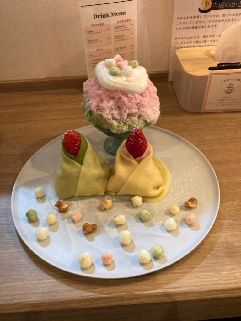 本日のメインお雛様のかき氷プレートは、氷自体に味を付けているからか溶けるスピードが通常よりも早かったです。お雛様の形をしたクレープや「ひなあられ」もあって可愛いだけでなく、おいしくって大満足です。