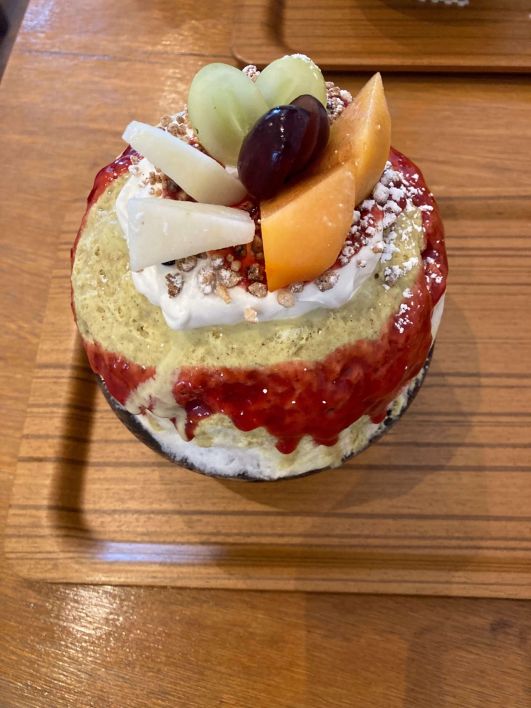 「ピスタチオミルク」は安定のおいしさで、ほぼ毎回注文します。上にのっているフルーツは以前食べたものと違っていて、今回はブドウ2種と柿とラフランスでした。柿はあまり好きではないのですが、すごくおいしかったです。氷だけでなくフルーツもおいしいのは感動しました。