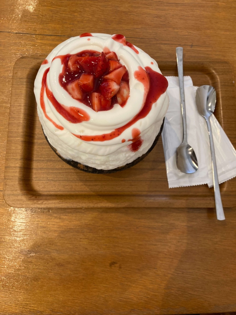 「酒粕クリームチーズといちご」はみためはショートケーキだけど、味は甘酒のようでおいしかったです。中にはあんこがたっぷり入っていました。