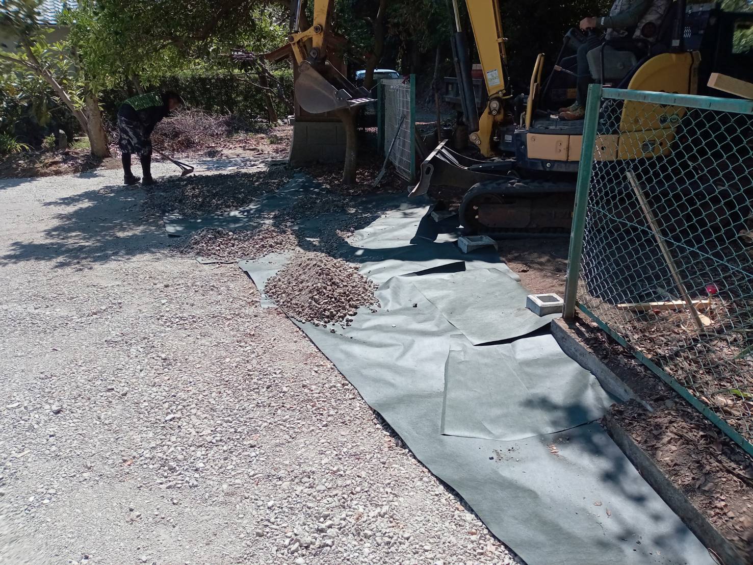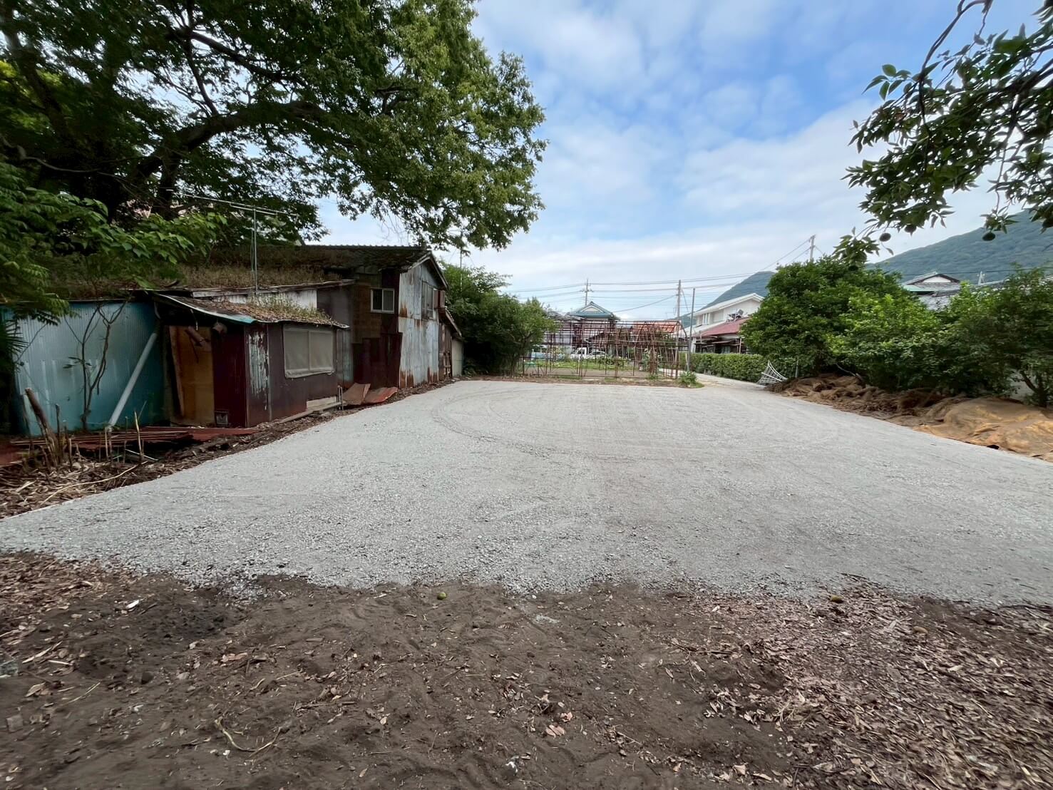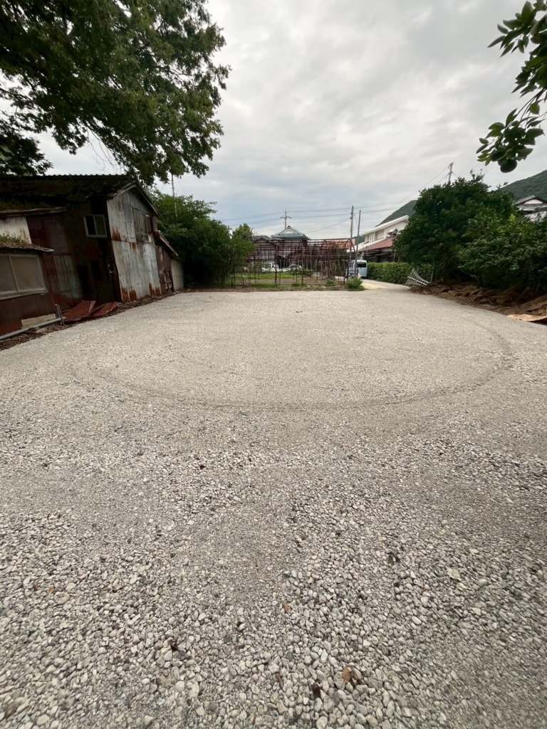 • 解体後は防草シートを敷いて砕石敷としました。砂利下の防草シートは直接日光に当たらないため半永久的に効果が持続します。
